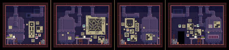 This room contains many papers with tetrominos with numbers on them. It also contains papers of other pictures and symbols, such as a picture of the skull, and infamously, a diagram of a face of the Hexahedron.